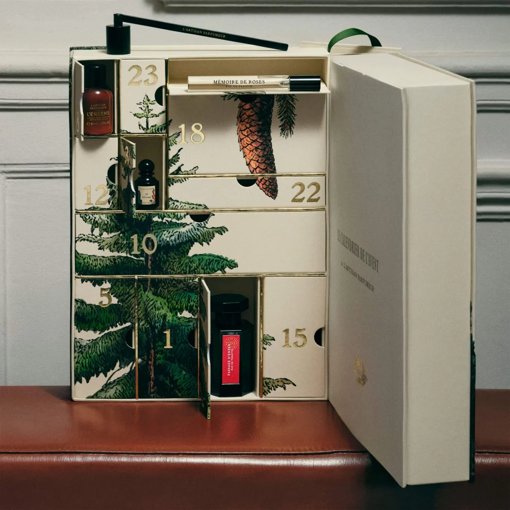 Dans le domaine olfactif, les calendriers deviennent des bibliothèques sensorielles. Diptyque orchestre Une Nuit de Cire et d’Or, où 25 surprises — bougies, eaux de parfum, soins, décorations — s’articulent comme les chapitres d’un conte nocturne. Chaque miniature célèbre la matière, le souffle chaud de la cire, le mystère de la résine et des épices. L’Artisan Parfumeur propose un coffret d’une richesse rare : 14 eaux de parfum, 8 soins et 2 accessoires. Une véritable cartographie des odeurs, traversant forêts, épices, fleurs et notes fumées. Ces maisons ne cherchent pas la démesure, mais la profondeur. Elles offrent une exploration patiente, presque initiatique, comme si chaque jour dévoilait une strate invisible du monde olfactif. L’Avent devient alors un apprentissage : sentir, reconnaître, se laisser surprendre. Un luxe d’attention, avant tout.