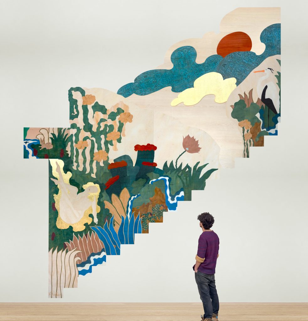 Entre marqueterie monumentale et jungle symbolique, Anton Laborde transforme le bois en récit contemporain poétique engagé.