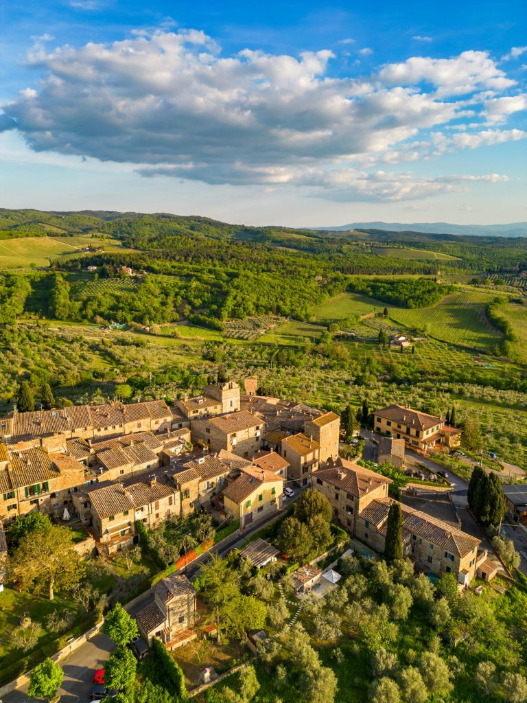 Montefioralle, overlooking Greve in Chianti, is limited to a handful of circular streets enclosed by ancient walls. Its small scale encourages attention to detail: flowered balconies, weathered facades, open views across vineyards.