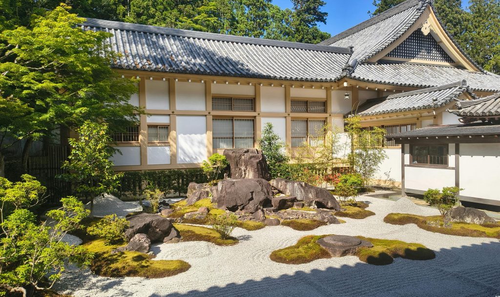 Les chambres sont d’une simplicité absolue : tatamis au sol, futon posé le soir, cloisons coulissantes en papier, parfois une vue sur un jardin intérieur. Ni télévision, ni minibar, ni bruit de climatisation. Dans les shukubō les plus remarquables, les cloisons sont ornées de fusuma-e, peintures réalisées par des artistes reconnus, et les jardins de pierre portent la signature de maîtres paysagistes — comme celui du temple Yōchiin, conçu par le célèbre Mirei Shigemori, classé monument naturel. L’élégance est partout, mais elle ne se signale jamais.